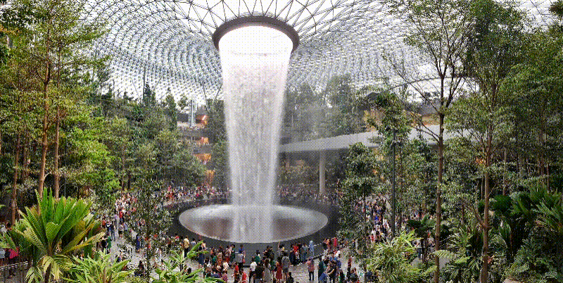• O Rain Vortex, no complexo Jewel, tem 40 metros de altura e é a maior cachoeira indoor do planeta. À noite, ela vira um show de luzes e sons!
