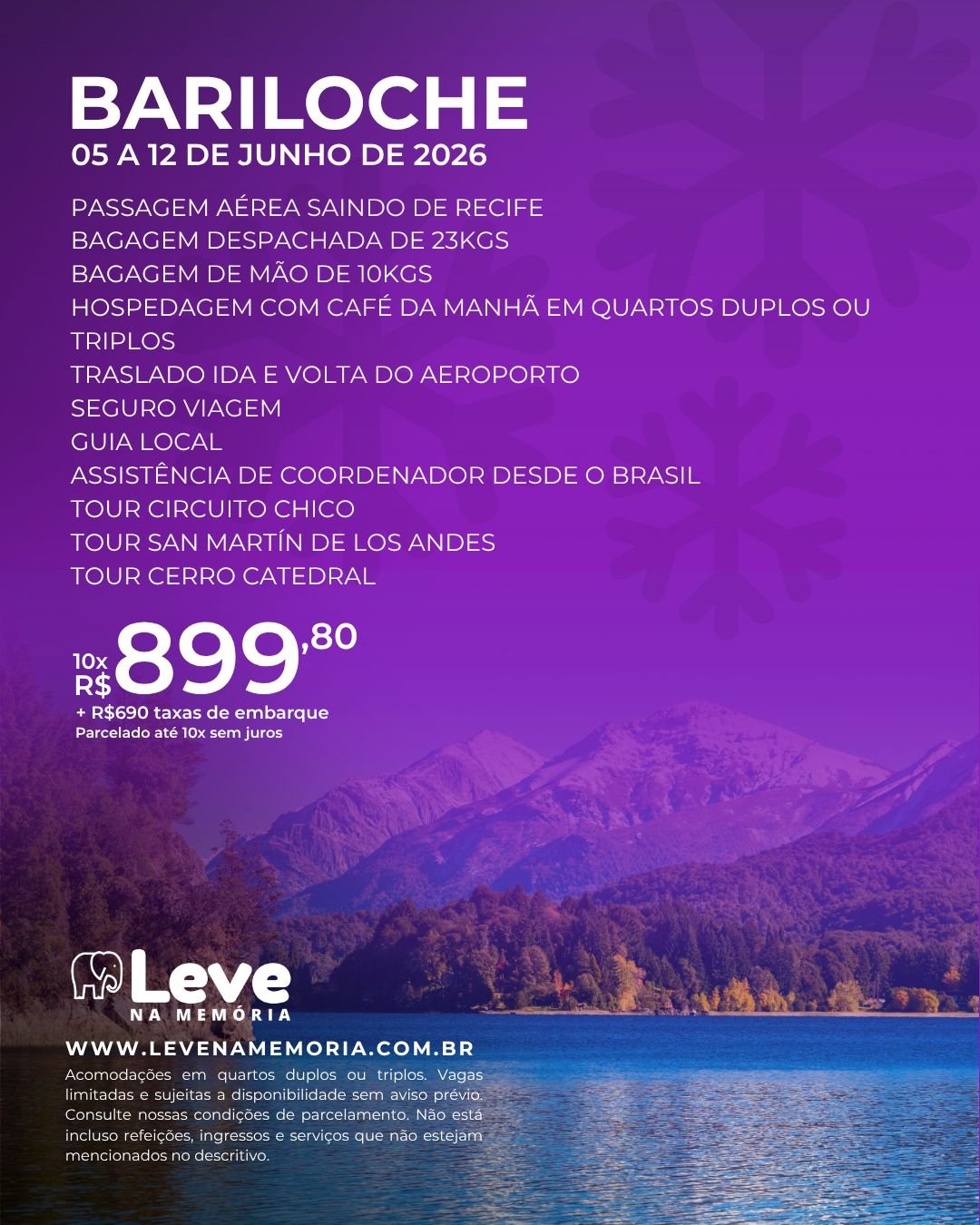 Viaje para Bariloche e viva a magia da Patagônia Argentina. Em meio a montanhas nevadas, lagos cristalinos e florestas exuberantes, este destino encanta em qualquer estação do ano. Nosso pacote inclui passagens, hospedagem com café da manhã, traslados e passeios pelos principais pontos turísticos, como o Cerro Catedral e o Lago Nahuel Huapi. No inverno, aproveite a neve com atividades como esqui e snowboard. No verão, descubra trilhas e paisagens deslumbrantes. Bariloche é ideal para casais, famílias e aventureiros. Uma experiência completa de beleza natural, cultura e gastronomia argentina. Tudo isso com o suporte e cuidado da nossa equipe especializada. Prepare-se para momentos inesquecíveis!